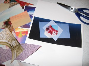 I got an e-mail that the local library was doing a class on collages. Yes, collages. Remember those? Tearing images out of magazines, arranging them somehow, gluing it all together? Well, adults do it too…and sell them for quite a bit of money. (Well, our teacher does at least!) Realizing I hadn’t been on an Artist Date in a while, I decided to attend the class.