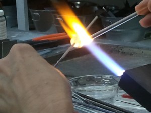 The apron is to protect me from flying shards of glass – which thankfully don’t happen too often if you know what you’re doing. The glasses are also to protect us from flying glass, and from the UV rays. Without the glasses, the flame looks bright orange: