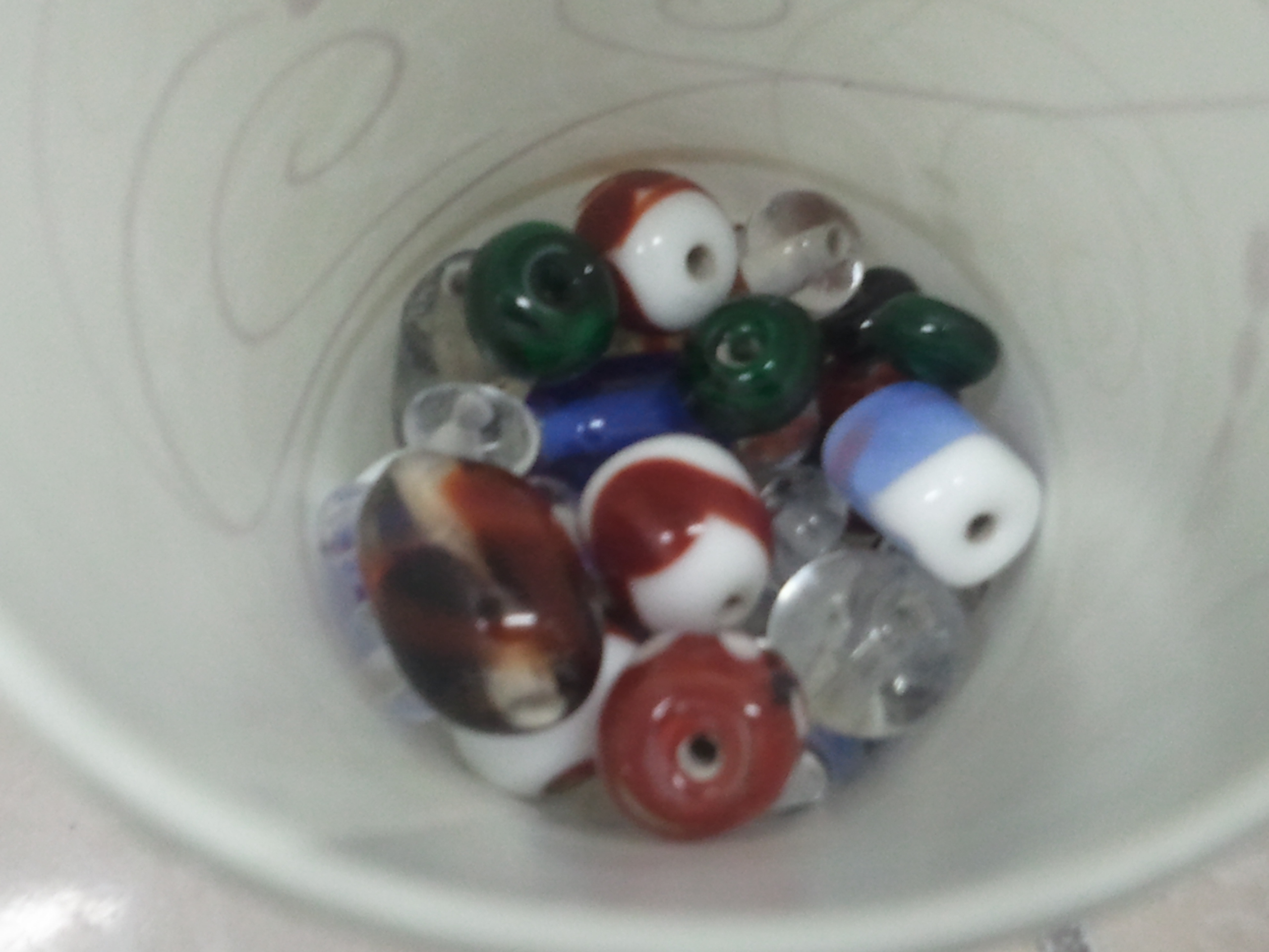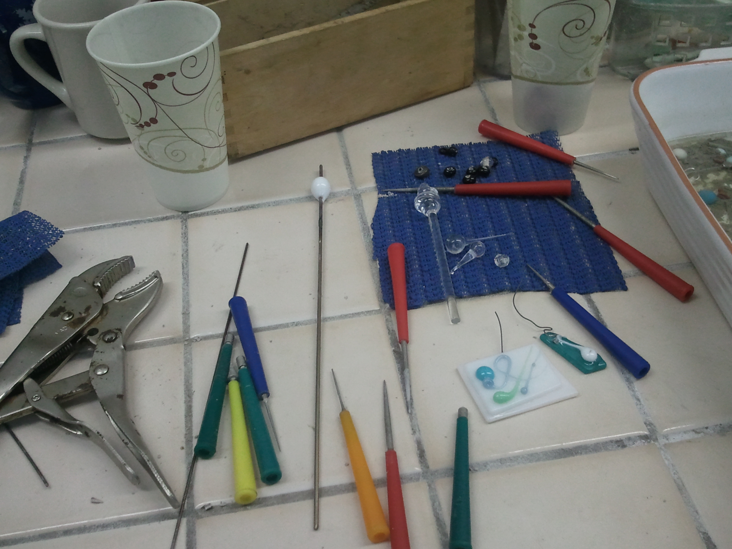 You put the mandrel with the bead on it in water to get the bead release off, then slide the bead off the mandrel. Sometimes the bead doesn’t want to come off. That’s either because it’s being finicky or because it’s stuck to the rod (and thus becomes the aforementioned plant decorator). If it’s the former, we can use a tool to hold the mandrel while we work to get the bead off. Then, you clean the bead release out of the middle of the bead and file down any rough spots (usually by the hole).
