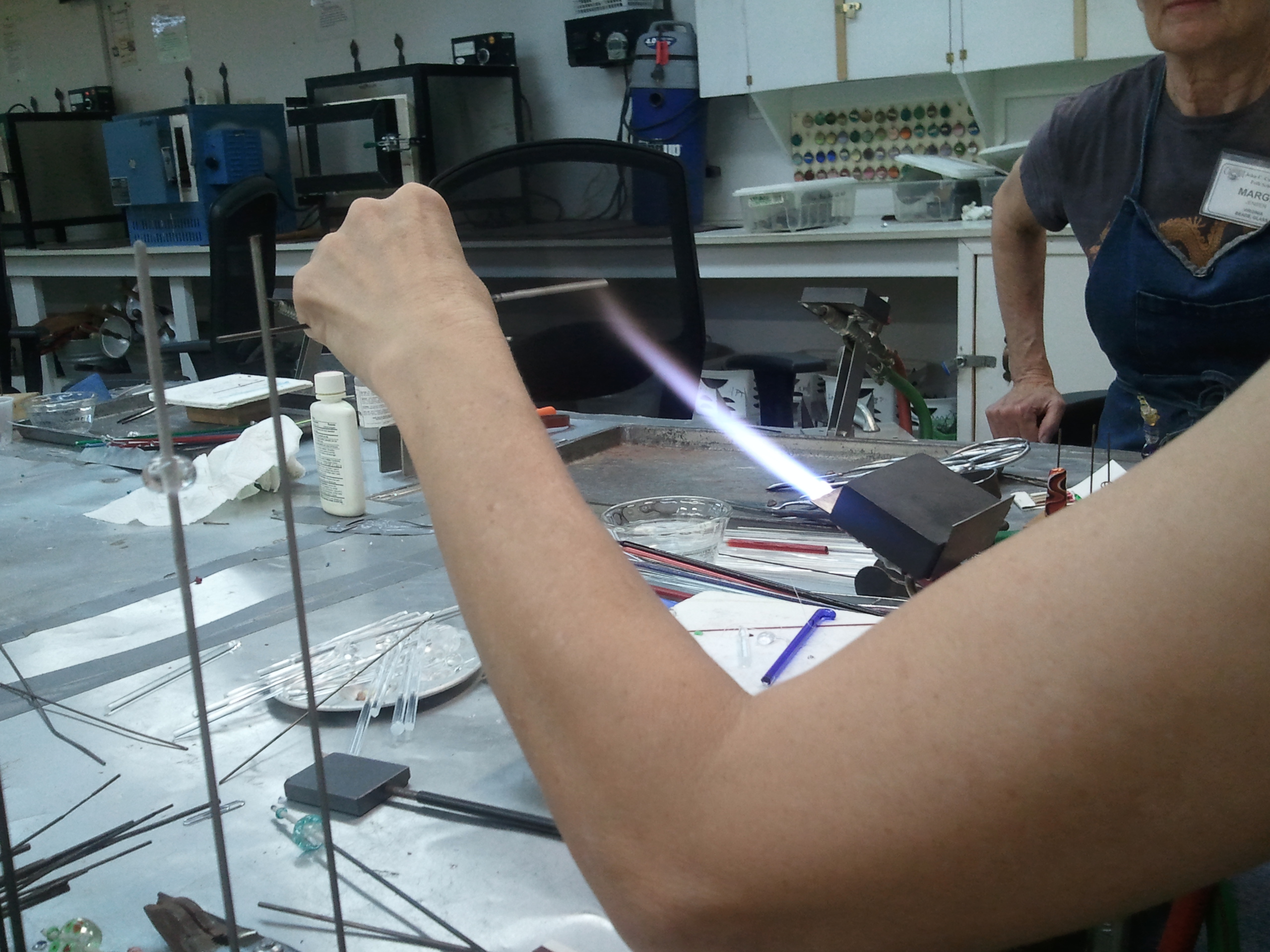 With the glasses, the flame is a pretty light blue – in which it is much easier to see what you are doing. The Folk School encourages visits to the studios while classes are in session, so if you walked into our class for a visit you’d have to don the glasses in order to see what we were doing!