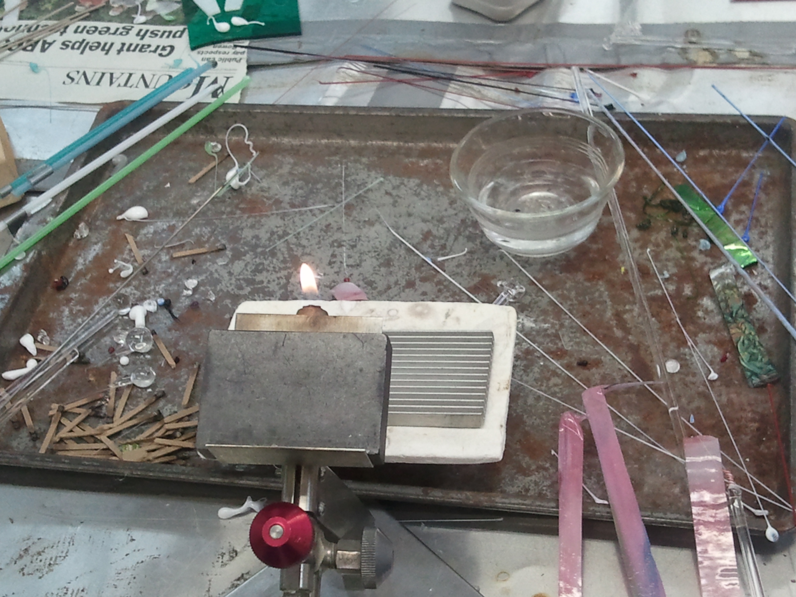 Before making a bead, you have to prepare the mandrel – a length of wire basically. We dipped it in a thick grey substance referred to as “bead release.” Then the mandrels get put in a block of wood to let them dry. The bead release keeps the hot glass from sticking to the mandrel. To hurry the drying process, we can heat the mandrel near the flame, but if we heat it up too quickly we’ll crack the surface. This is not good – the hot glass can seep through those cracks and stick to the metal, and then you have no way to remove the bead from the mandrel – but you’ve made a lovely plant decorator. I only made one of those – on our last day, no less:)