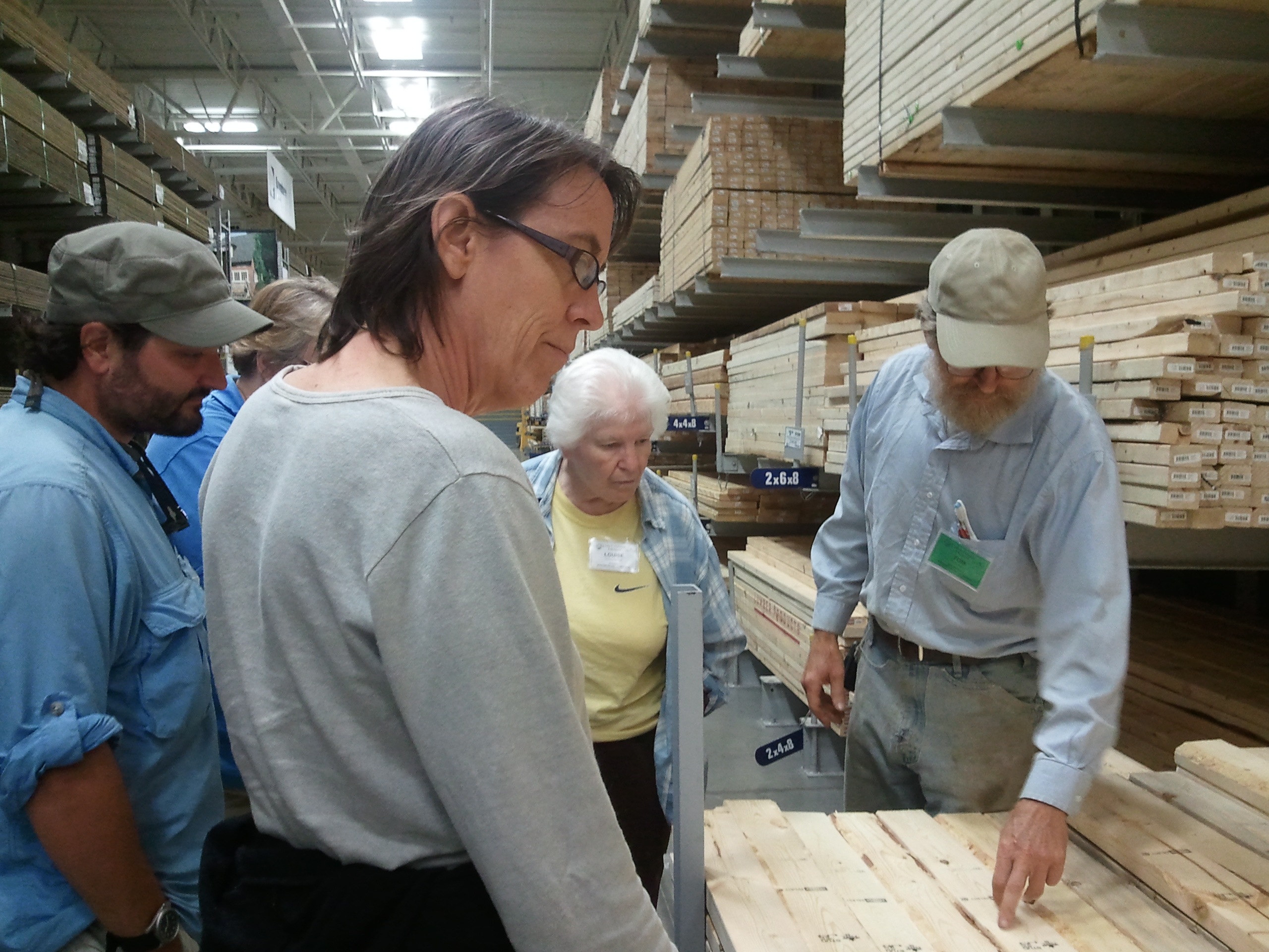 So after our lesson on building materials, I got behind the wheel of the Folk School Suburban and drove us all to Lowe’s. I walked into that store looking almost like someone who belonged there (i.e. dressed in jeans and sneakers as opposed to heels and a skirt). Tom led us into an aisle I never would have dared enter prior to this class: the one full of wood. Tom patiently answered everyone’s questions about two-by-fours, plywood, and roofing materials.