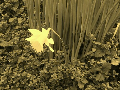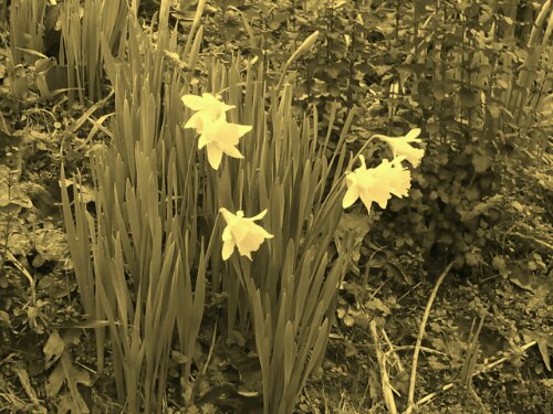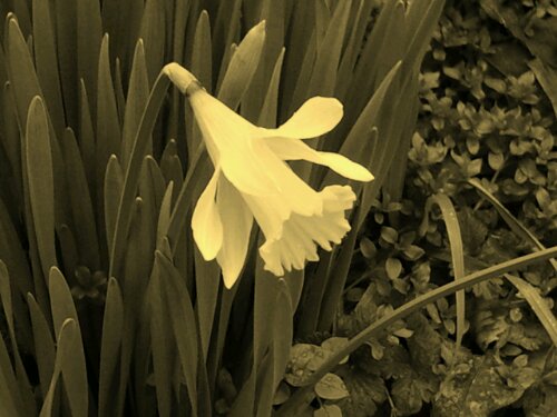 They literally stopped me on my morning walk – the yellow daffodil blooms vibrant against a deep green hillside. I pulled my cell phone out of my jacket pocket to take a picture. I’ve wanted to take a photography class but haven’t made it a priority yet. In the meantime, I’ve been playing with the settings on my phone. Changing the “Exposure Level,” I’ve learned, changes the amount of light – though I don’t know what setting this would be on my actual camera. Today, I learned I have both black-and-white and sepia options. Playing around, I got some shots I’m actually quite proud of!