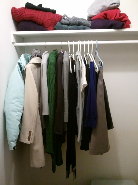 The process of choosing wasn’t as hard as I thought it would be. I started with the jewelry. I opted for one pair of earrings, my favorite necklace, and a watch. I chose six pairs of shoes, three coats, and the rest comprised jeans, sweaters, shirts, pants, one dress and one skirt.