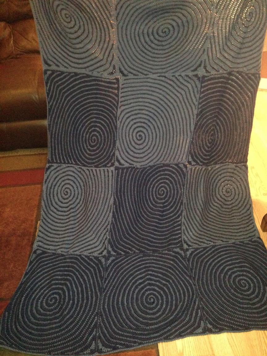 And so it was that I set about finding a pattern for Jeffrey. No flowers. No fringe. Certainly no lacy open-work. The first pattern I picked, once I got started, I found boring. If I was bored making it, I’d surely never finish it. So a mere month before Christmas I decided on a different pattern: the Vortex Afghan.