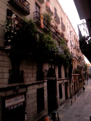 “Is that yours?” I asked pointing to the pack. He looked at me as if he didn’t understand. He squatted down to work at the straps, and I did the same, hiking my purse up onto my right shoulder, and tucking my cheese and bread under my left arm. The two of us spent a good thirty seconds calmly working together to free the straps. “Attends,” I said, when he was pulling the wrong way and making it worse. I figured out what we needed to do to free the final strap and, pointing to where it was caught, said, “ici” (here). Having been in Barcelona less than an hour, I was till thinking in French.