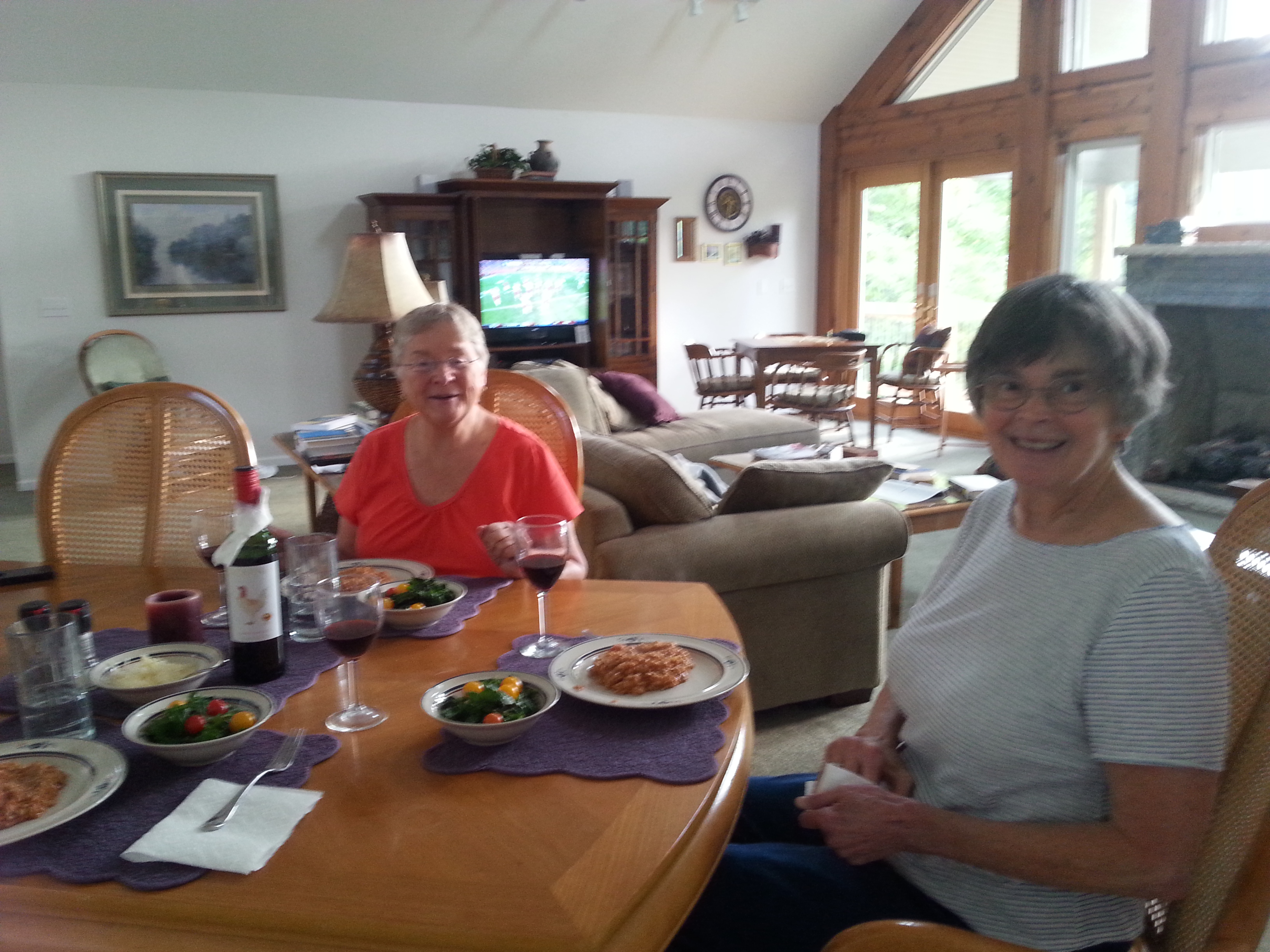 Confession: My favorite parts of my writing retreats are the good food, good wine, and good friends–namely chocolate cake, Writers Block Petit Syrah, Lois (L), Lynne (R) and Stacey (sadly, not pictured).