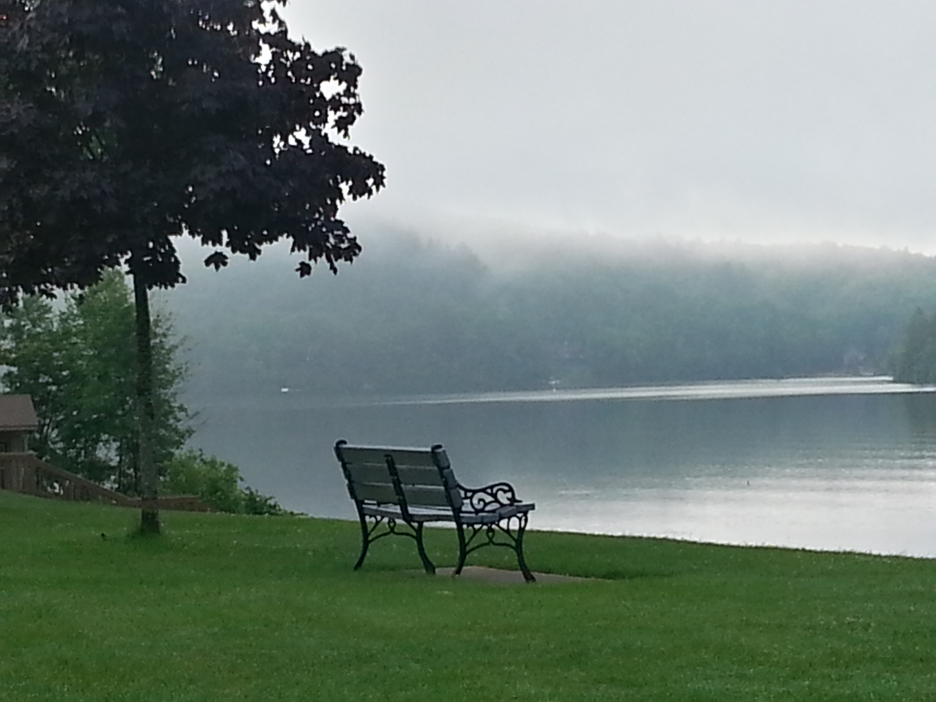 This morning, I walked down to a fog-covered Schroon Lake with Michael and my father, up past the boathouse, and then parted ways with them: they headed to Stewart’s for the morning coffee klatsch, I went off with a goal to walk more miles than I did yesterday.