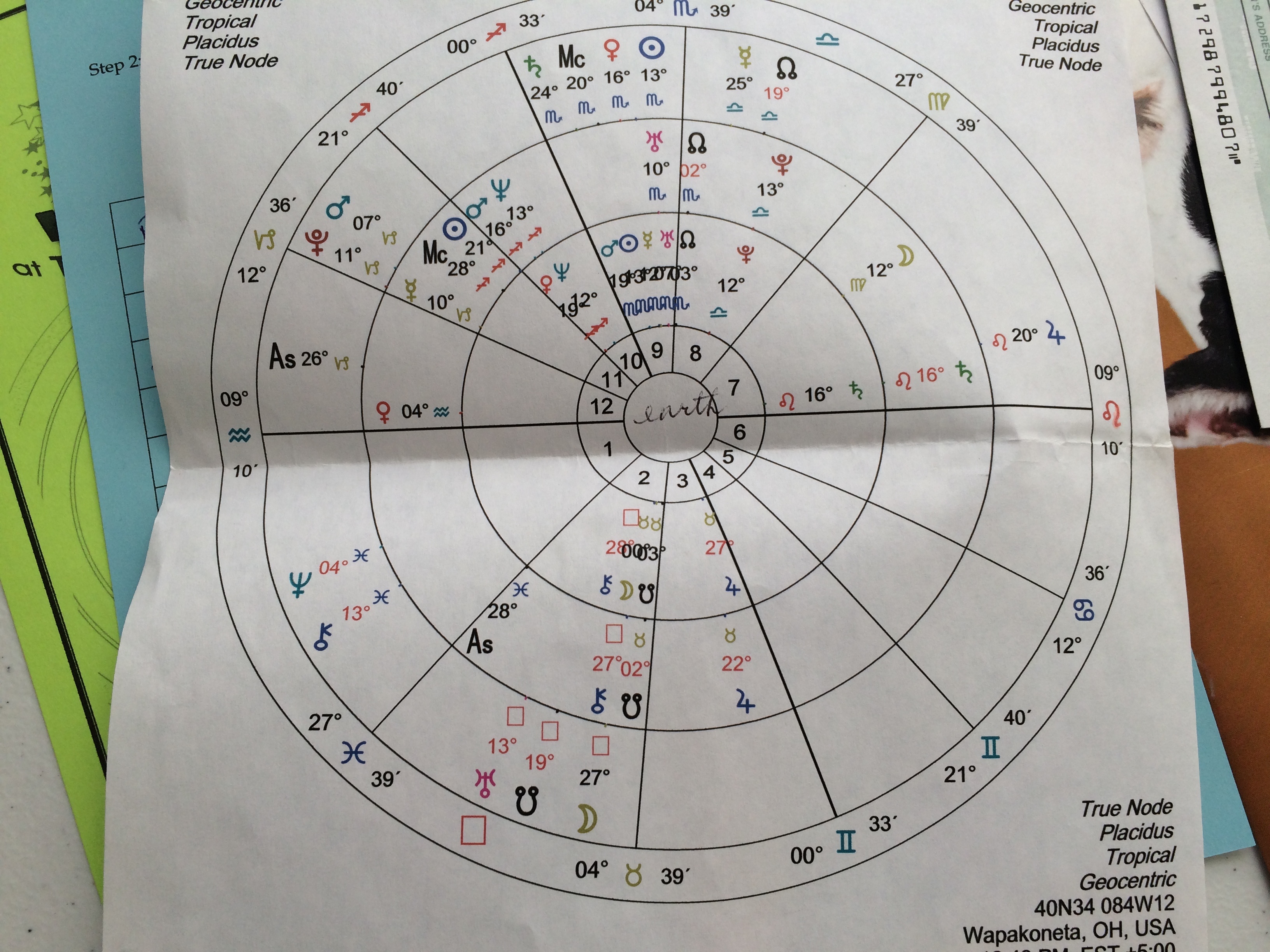 “The first thing I’m going to talk about is your birth chart,” the woman said to me. We weren’t in the same room, nor even the same state. It was November, 2014, and my friend Lois had gifted me with an astrology reading–my first ever. The astrologer, Sue Lovett, lives in Ohio, so she recorded her reading and sent it to me in New York, along with my “birth chart.”