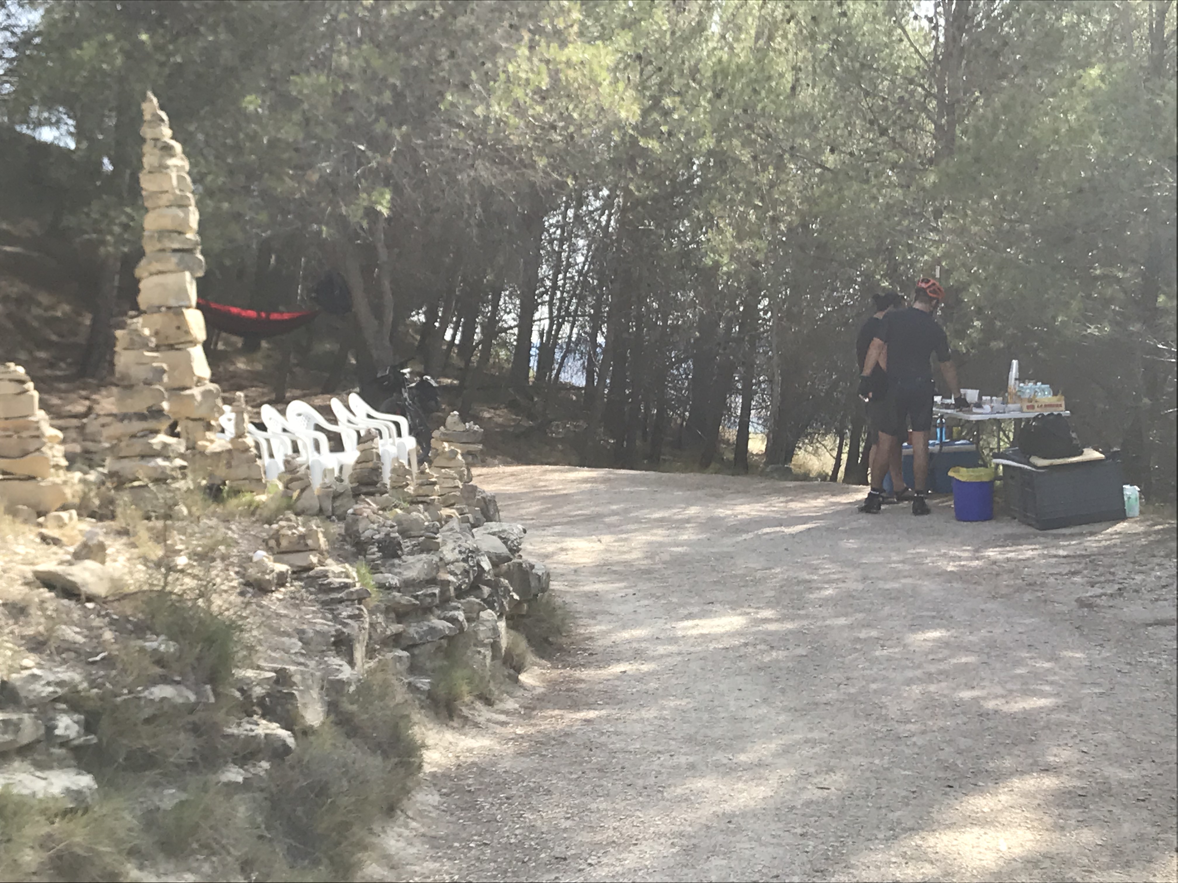 Dad and I helped ourselves to cold drinks from the cooler and dropped our money onto the plate sitting on the table.  Though I’d just spent 20 minutes sitting, this new scene was an upgrade from my previous seat, so I said to a Dad, “Let’s hang out for a minute.” At seeing this, the man got up and lit a cigarette. “Habla Inglés?” I asked. “A little,” he muttered, still seeming a bit apprehensive about engaging with us. “Entiendo un poco español,” (I understand a little Spanish), I said,  hoping this would endear him to me a little more so that I could satisfy some of my curiosity about him and his little oasis here on the Camino.  I asked about the cairns, and he explained that he made them all himself. “Only using things from nature. Things from right here,“ he said.