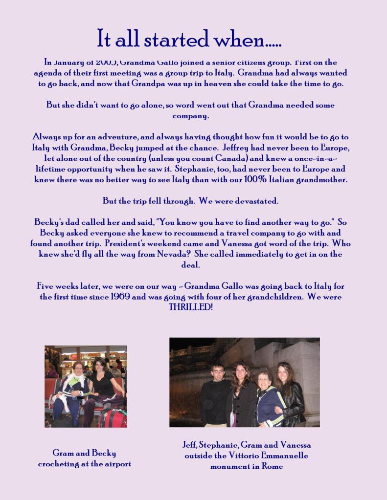 My siblings and cousins posted pictures on Facebook yesterday of themselves visiting Grandma on her special day. My sister Liz also posted an older picture of Liz and Grandma and that gave me an idea. . . Long before I started this blog, I took one of my most memorable trips: me, my brother, two cousins, and then-82-year-old Grandma Gallo went to Italy. Upon our return, I made a scrapbook. But it wasn’t just pictures. . . I told a few stories, as well. So here it is. Happy Birthday, Grandma Gallo!