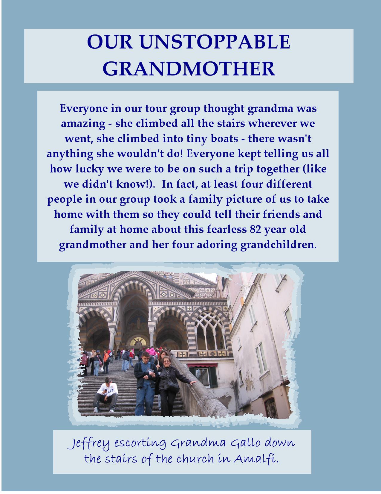 My siblings and cousins posted pictures on Facebook yesterday of themselves visiting Grandma on her special day. My sister Liz also posted an older picture of Liz and Grandma and that gave me an idea. . . Long before I started this blog, I took one of my most memorable trips: me, my brother, two cousins, and then-82-year-old Grandma Gallo went to Italy. Upon our return, I made a scrapbook. But it wasn’t just pictures. . . I told a few stories, as well. So here it is. Happy Birthday, Grandma Gallo!
