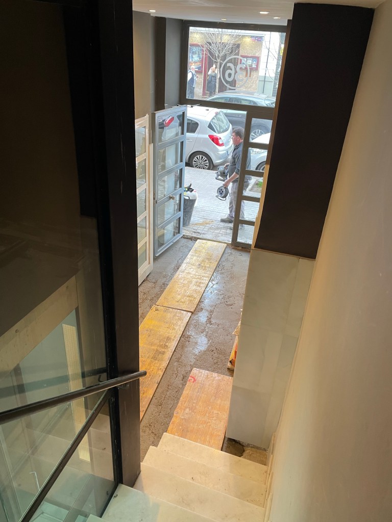 “A las seis?” the man says, uncertain. He points to the foyer and says some things that I take to mean they will have some sort of cover for us to walk over the cement by 6p.m. I imagine that’s the end of their work day.