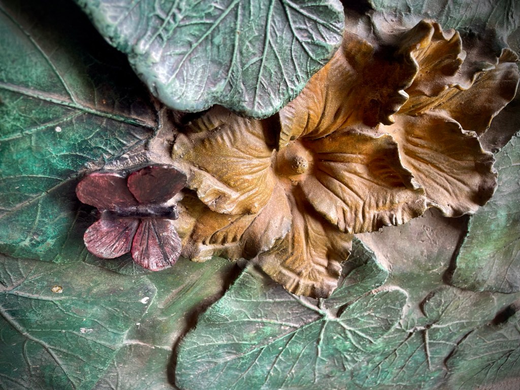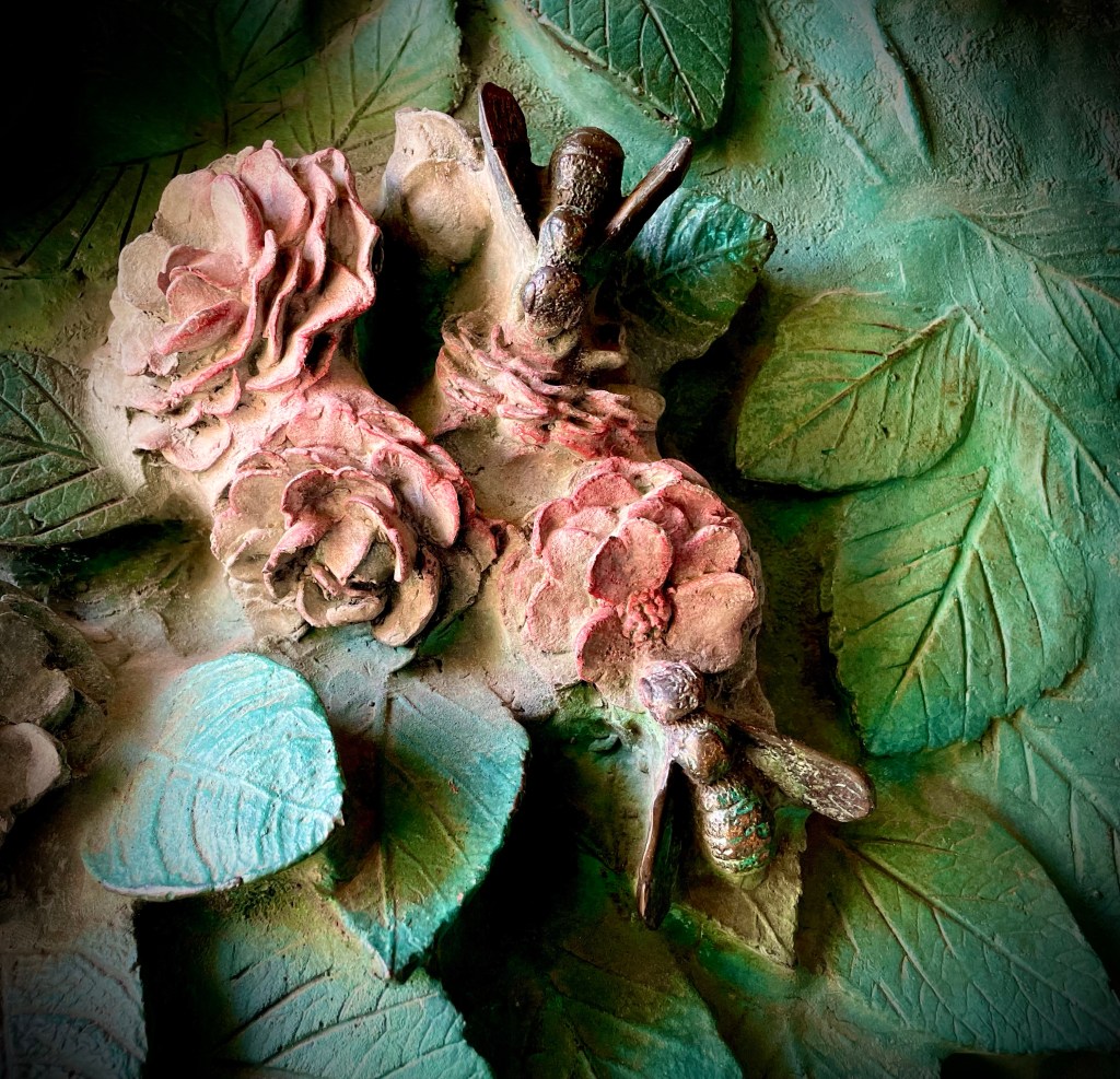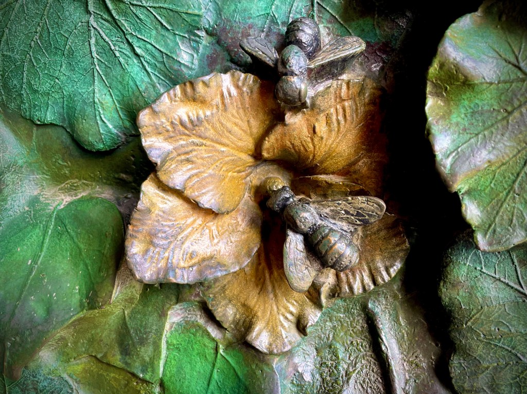 Like everyone, she, too, has changed a bit in nine years. She now has delicate doors to her soul open for all to see. And what doors they are! A wall of greenery in bronze that gave me pause. I studied them, slowed down to really take them in. And only by doing so, saw even more. Hidden amongst the leaves, bees gathered pollen, butterflies paused for a moment on pink and yellow flowers, baby birds opened their mouths to be fed.